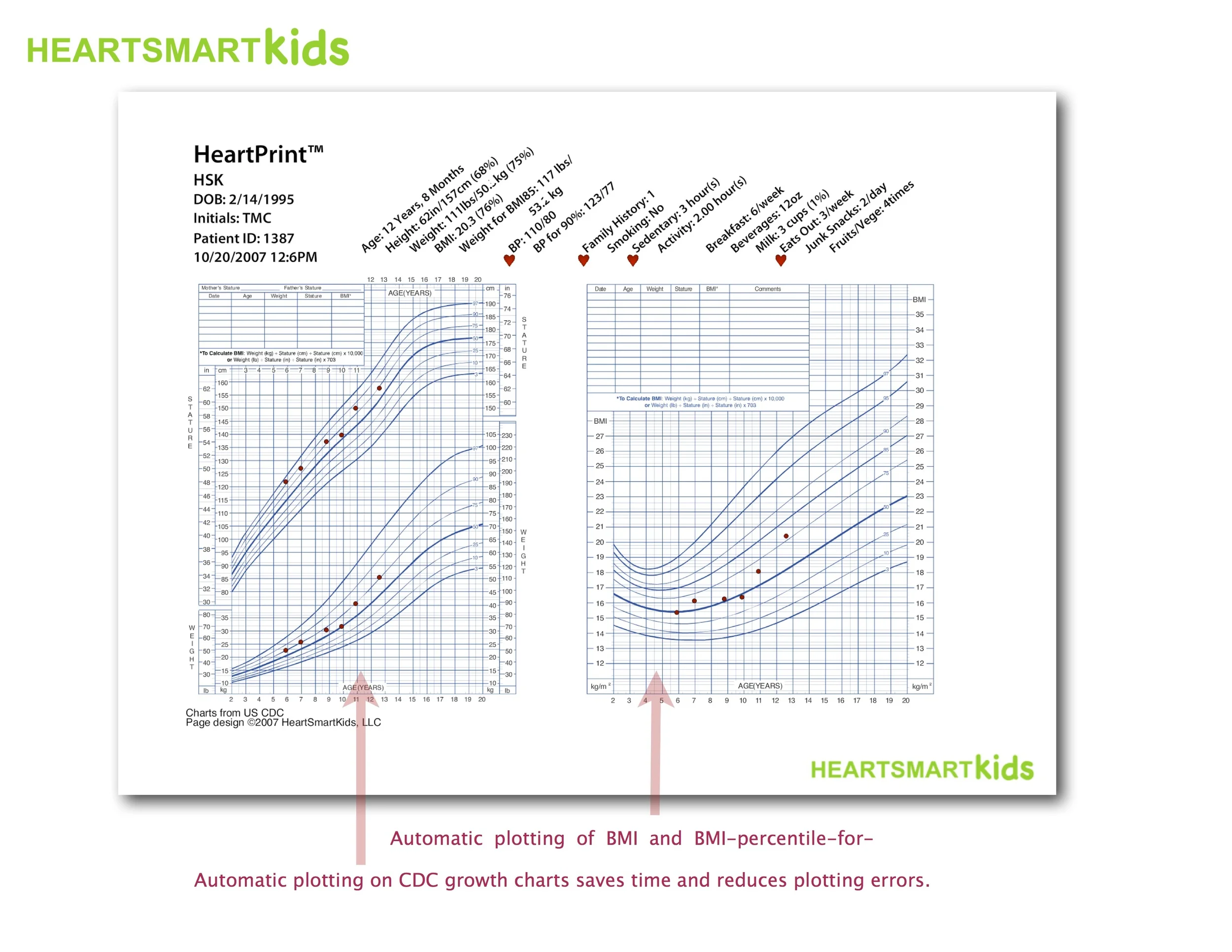 The largest element of the HeartPrint is the standard CDC growth charts. These charts indicate how a child’s height, weight, and BMI compare to established growth standards. In addition, the child’s measurements and exact percentiles for height, weight, and BMI are printed at the top of the HeartPrint. A BMI percentile between the 85th and 94th percentile is considered overweight. Above the 95th percentile is considered obese.