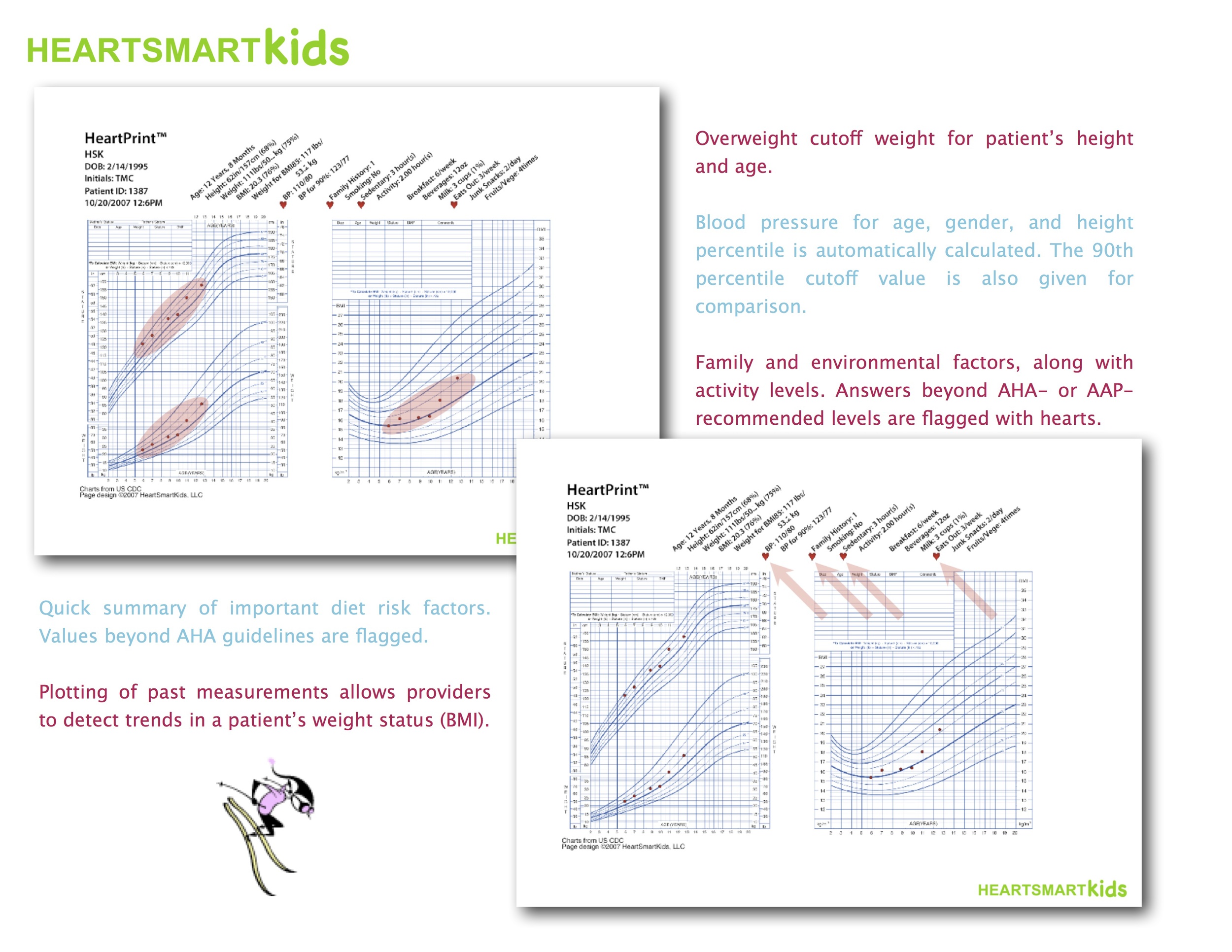 The HeartSmartKids (HSK) system addresses three difficulties in counseling on health risks: acquiring timely data, efficient data presentation, and counseling on modifying unhealthy behaviors. The HSK system addresses these three points with a touchscreen interview, the HSK HeartPrint™, and customized guidance for practitioners and patients.